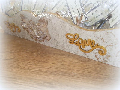Caixa envelhecida,com tampa trabalhada em pérolas e aplique de resina.