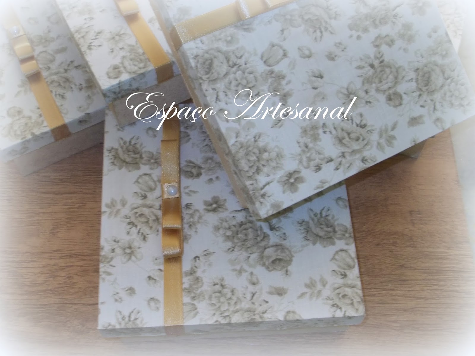 Caixas revestidas em tecido,com acabamento em fita de cetim e laço chanel.