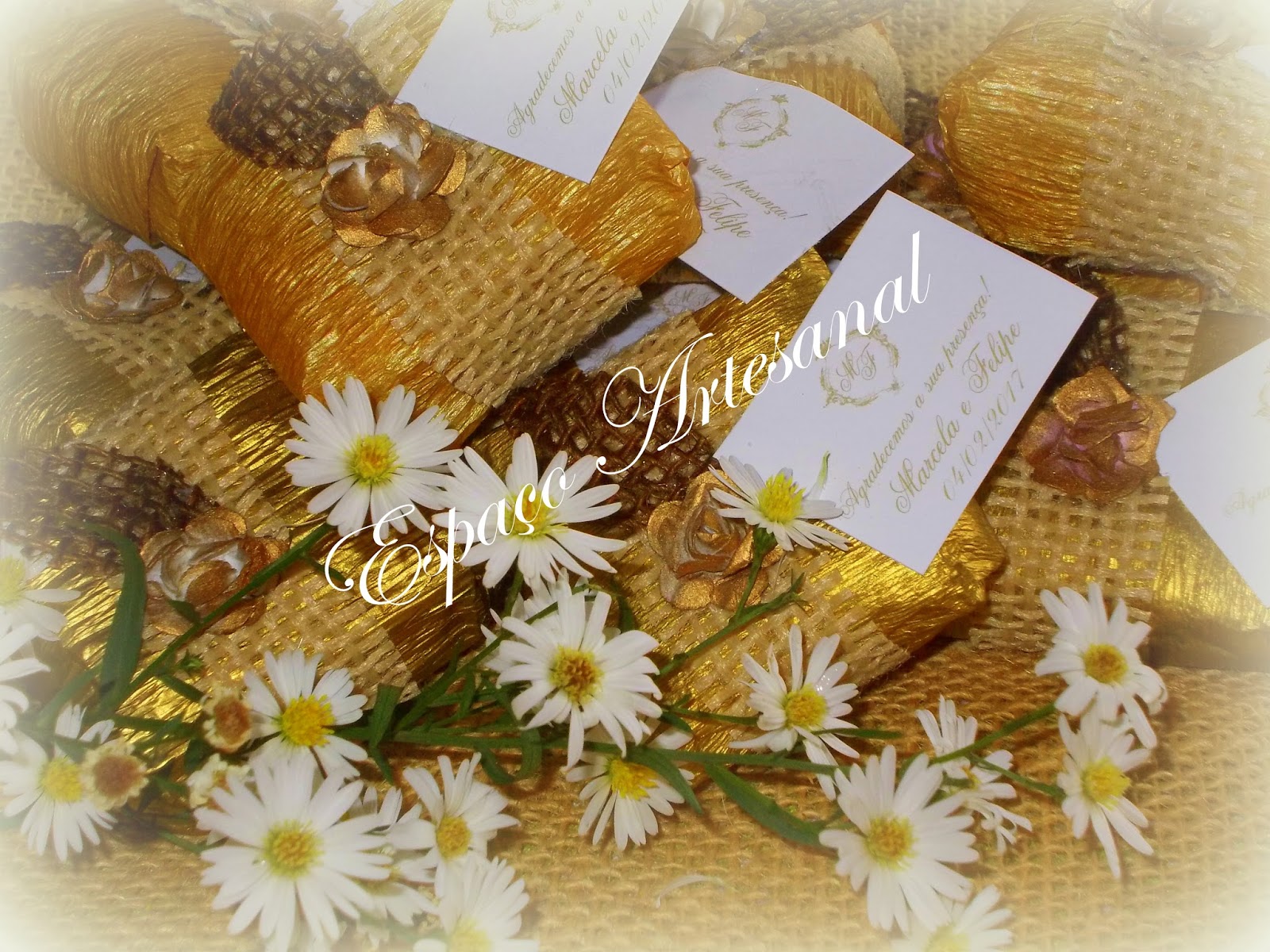Argolas confeccionadas em juta com apliques de mini rosas douradas.