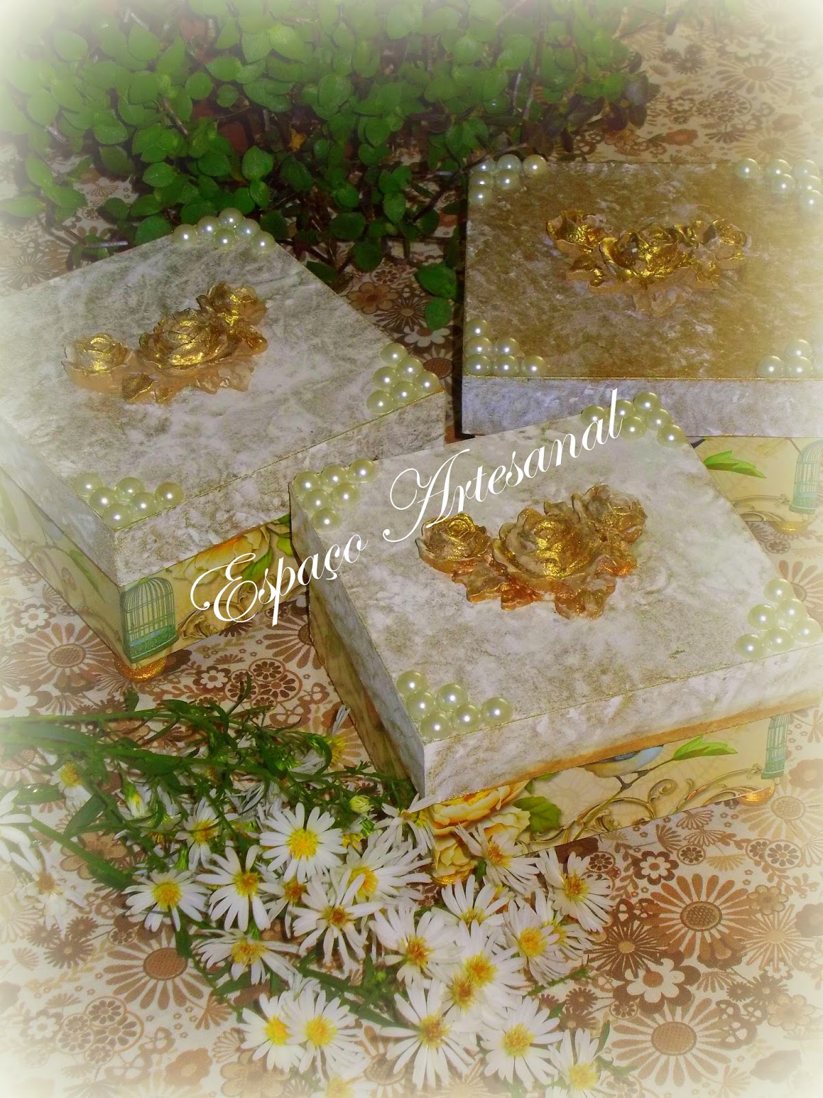 Caixa envelhecida,com tampa trabalhada em pérolas,aplique de resina e faixa decorativa "vintage".