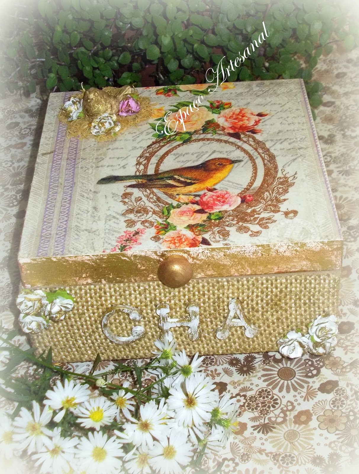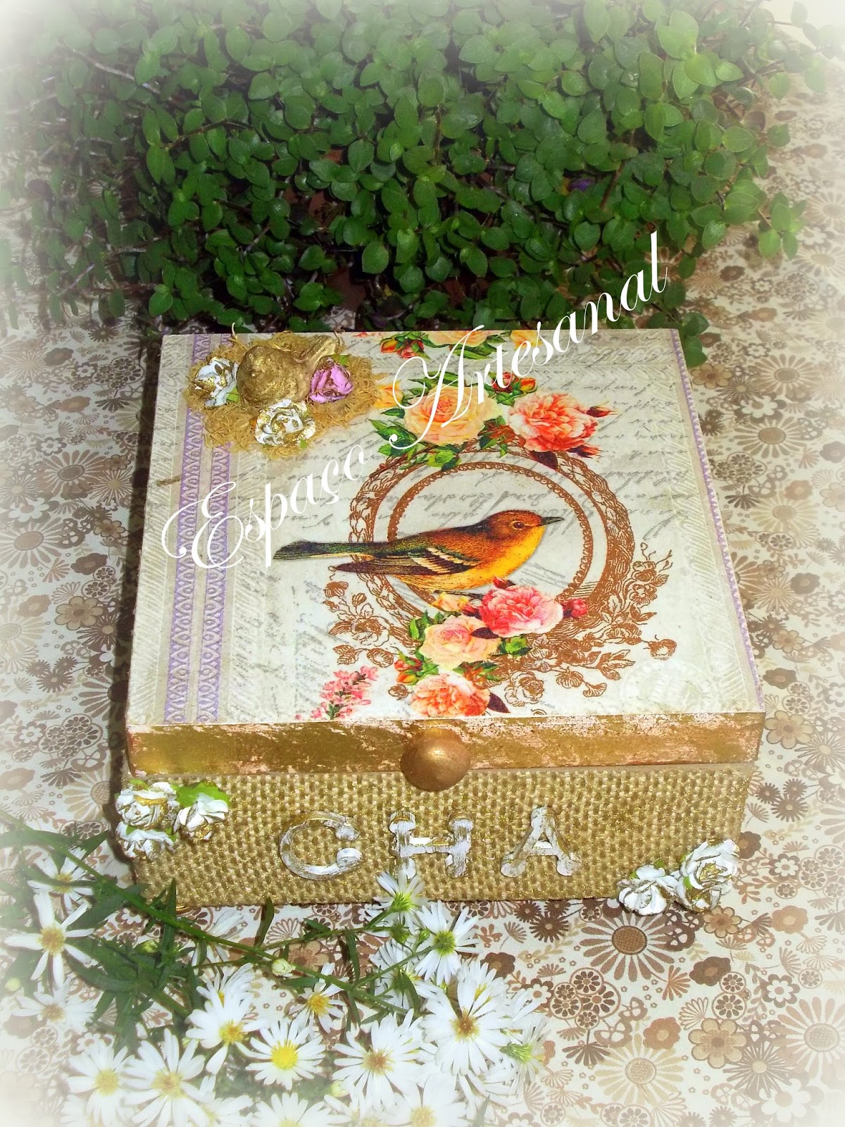 A caixa foi trabalhada no estilo "vintage",com aplicação de juta,aplique de resina e mdf,mini rosas e pintura envelhecida.