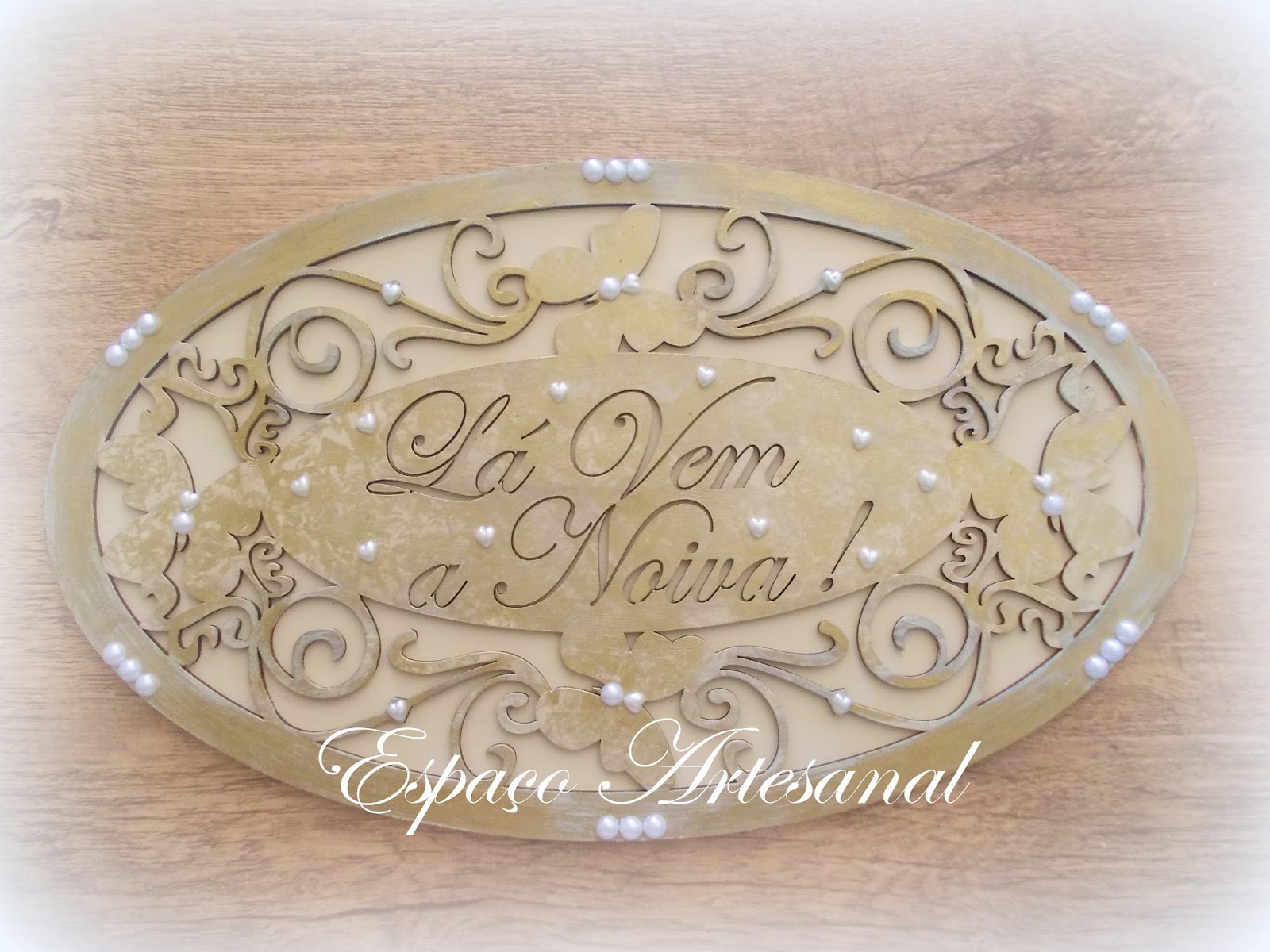 Bandejas  envelhecidas trabalhadas em pérolas e aplique de resina,acondicionaram os doces da recepção,compondo a mesa do bolo.
