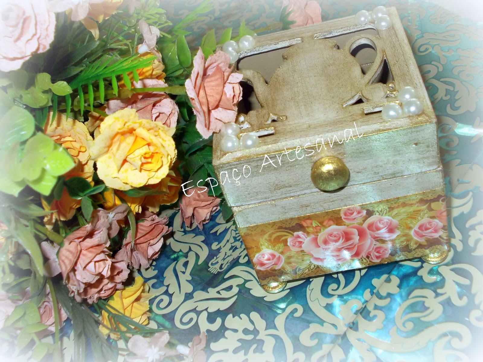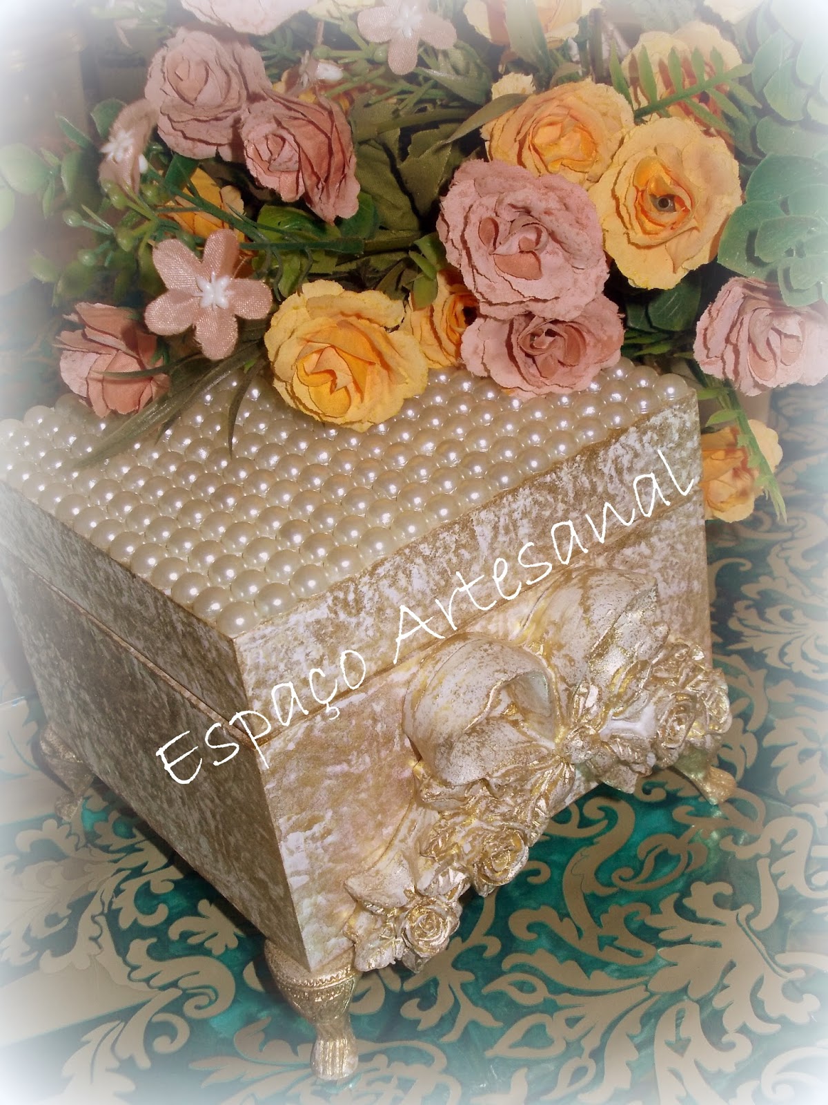 Caixa envelhecida,com tampa trabalhada em pérolas e aplique de resina.