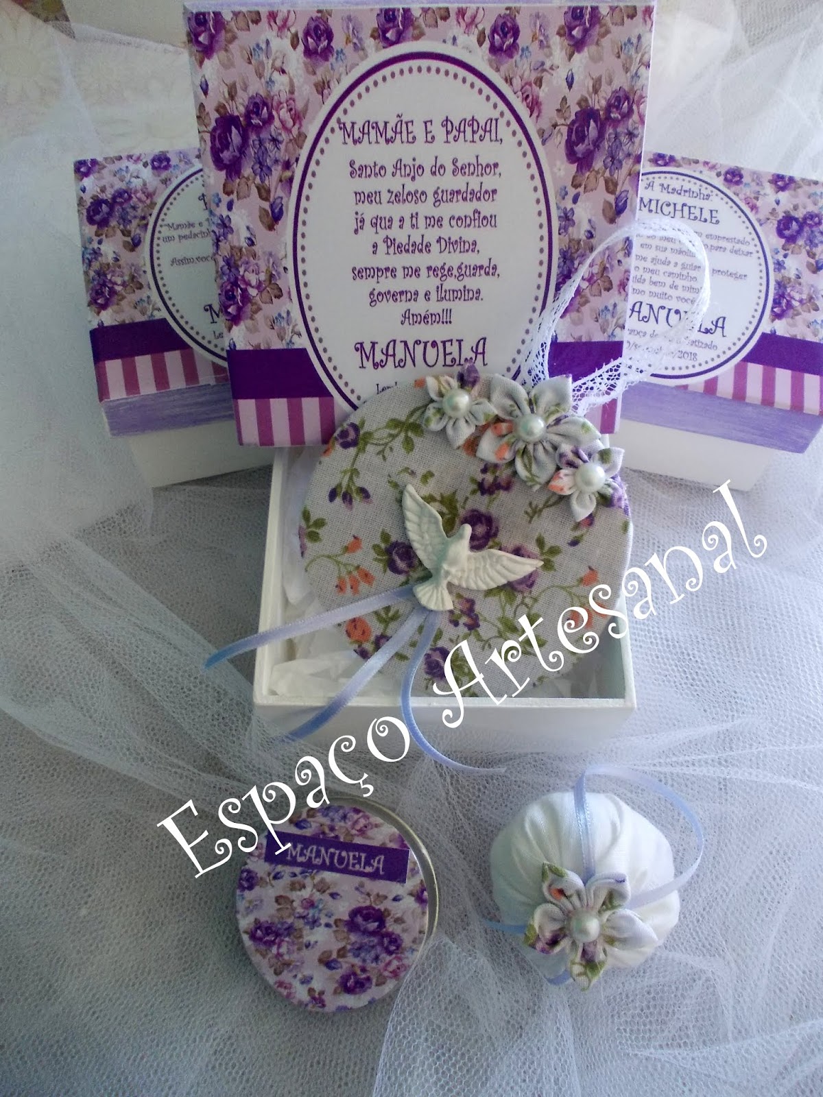 Caixas adesivadas;dentro das caixas,sachê flor, mini móbile do Espírito Santo e latinha de balinhas.